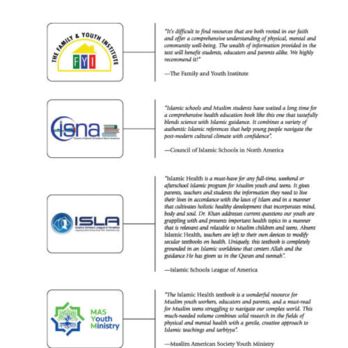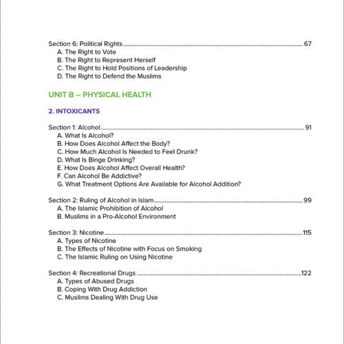 Level 4 presents topics designed for students aged 13 years and older. This level addresses several units including Social Health that addresses a comparison of women’s rights in accordance to Islam with current times; Physical Health in the use of alcohol and drug use and its effects at the physical, mental, and spiritual level; Mental Health that explores common mental illnesses, treatment options as well as a discussion on suicide in the Muslim community; and Spiritual Health that addresses ways to maintain Allah at the center of one’s life in spite of ongoing temptations and outside influences.